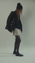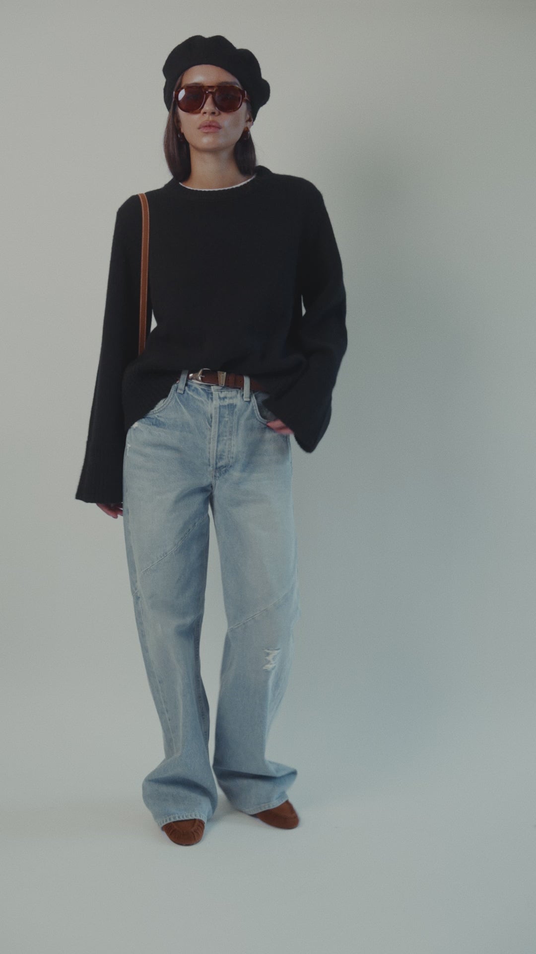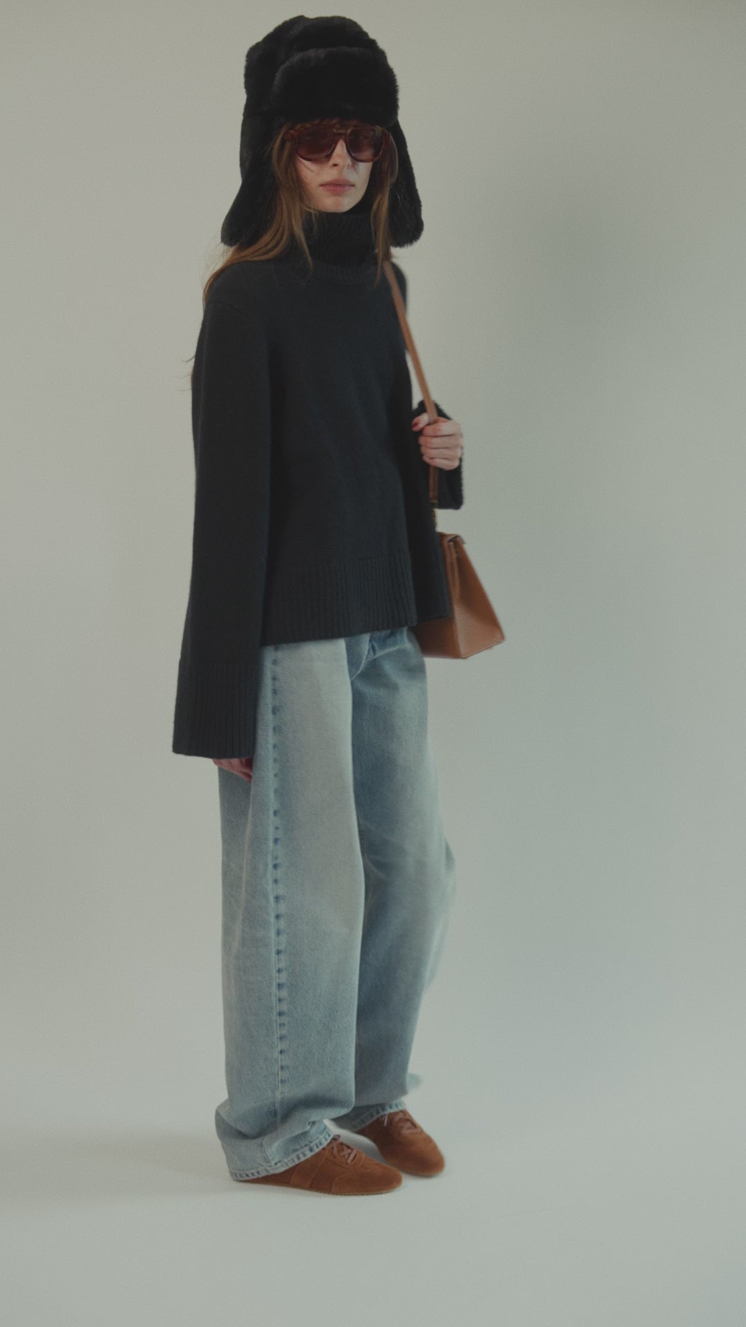 The Gloria sweater will fit relaxed and slouchy. The sleeves will be long and can be cuffed or rolled accordingly.